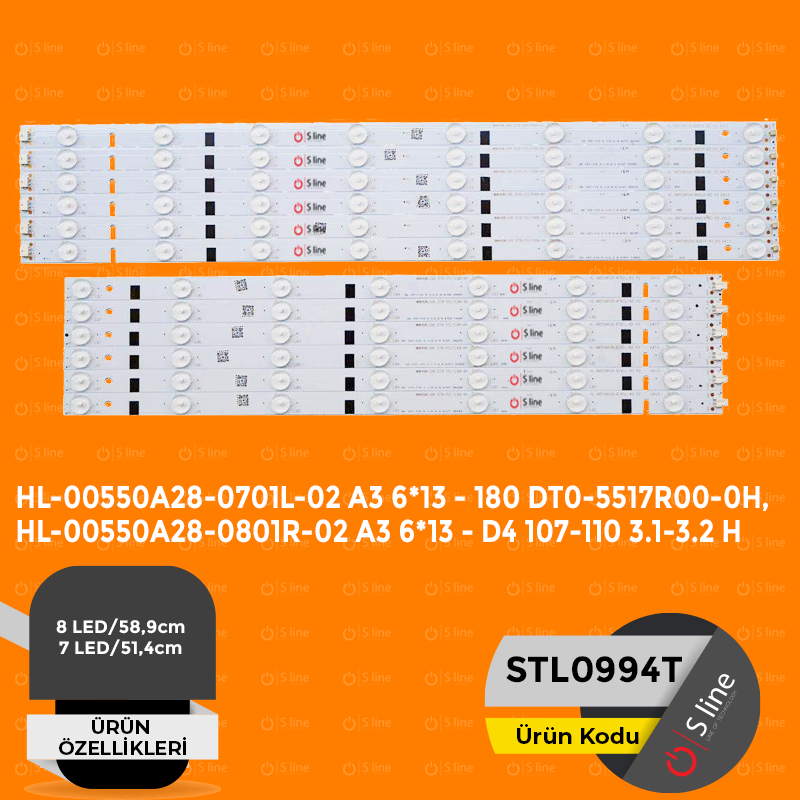 | TV LED ORJİNAL KODU | HL-00550A28-0701L-02 A3 6*13 - 180 DT0-5517R00-0H,HL-00550A28-0801R-02 A3 6*13 - D4 107-110 3.1-3.2 H | |