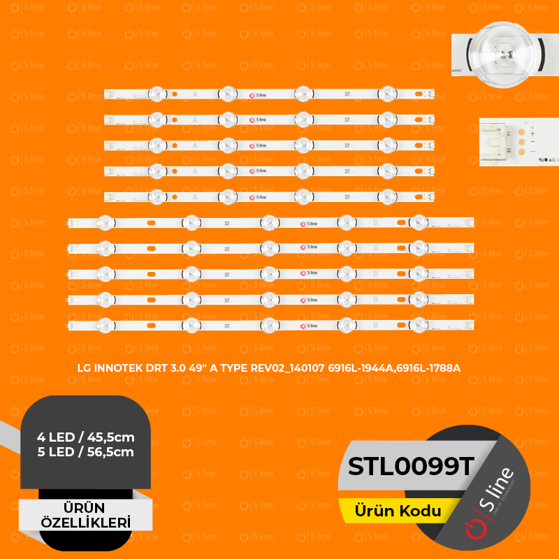 DRT 3.0 49" A TYPE REV02_140107 6916L-1944A, DRT 3.0 49" B TYPE 140107 6916L-1945A Orjinal Tv ledi kodu ile arama yaptığınızda LG Modelleri ile uyumlu olan STL0099T Tv Ledine SLine güvencesiyle sahip olabilirsiniz. LG 49LB5500 led bar, LG 49LB550V led bar, LG 49LB561V led bar, LG 49LB570V led bar, LG 49LB580V led bar, LG 49LB585V led bar, LG 49LB5610 led bar