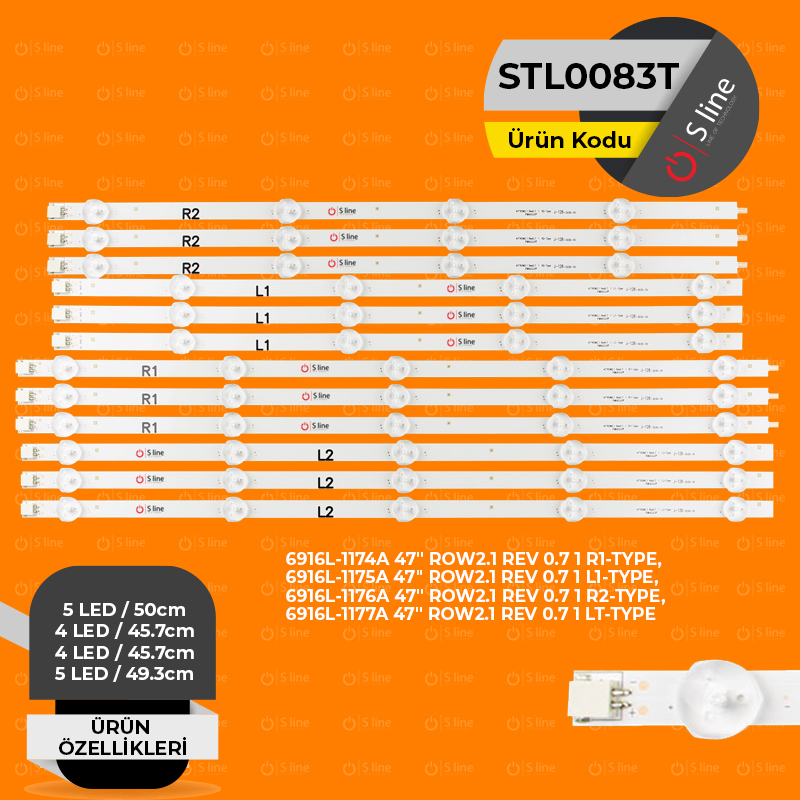 47" 6916L-1174A,6916L-1175A,6916L-1176A,6916L-1177A Tv ledi kodu ile arama yaptığınızda LG, Philips Modelleri ile uyumlu olan STL0083T Tv Ledine SLine güvencesiyle sahip olabilirsiniz.